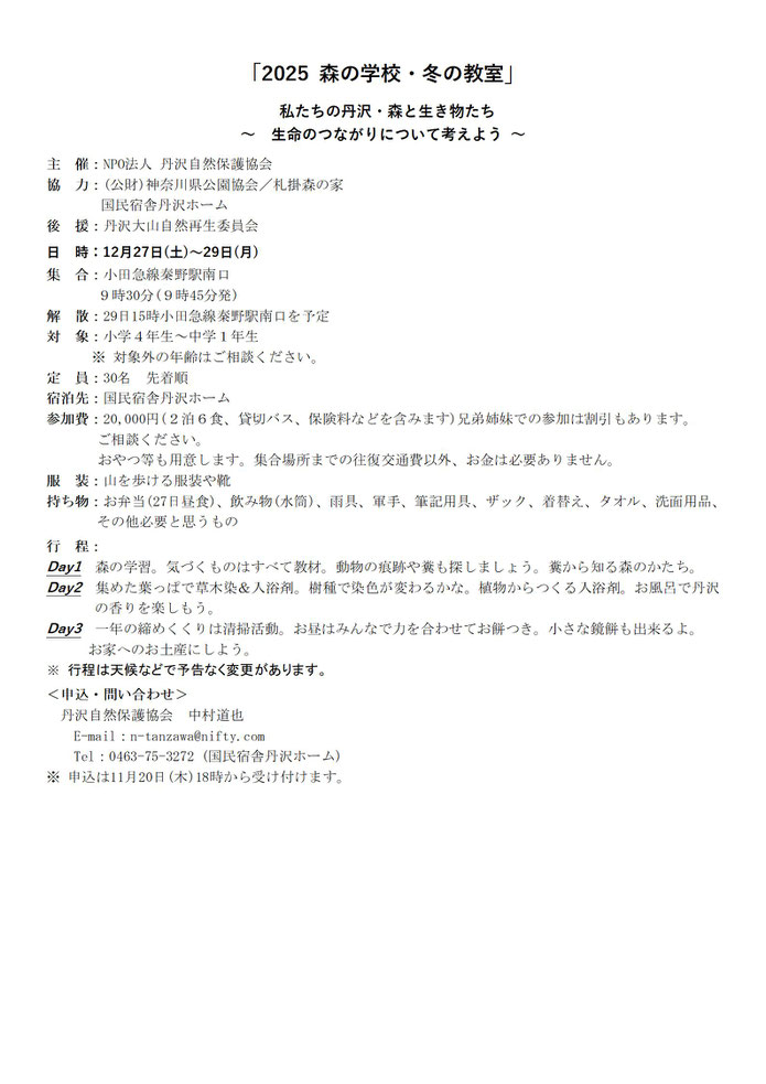 森の学校「冬の教室」参加者募集